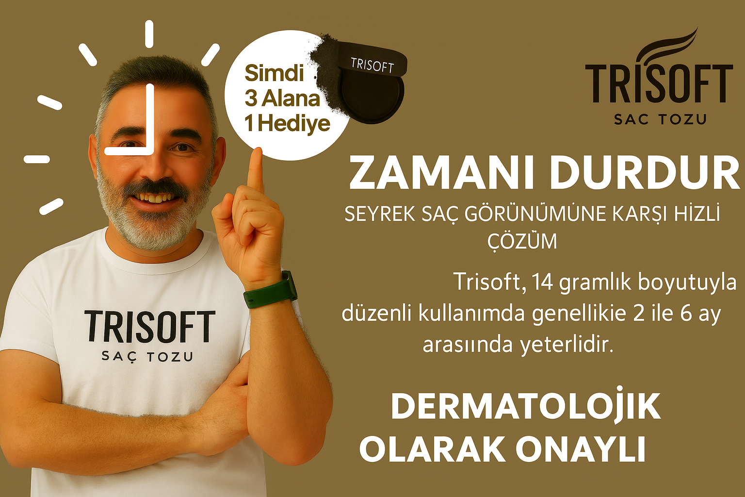 TRISOFT saç tozu, ince veya seyrek saçlarda saniyeler içinde dolgun ve doğal bir görünüm oluşturur. Suya ve tere dayanıklı yapısıyla gün boyu kalıcılığını korur.